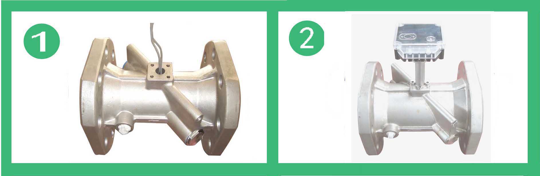 b.樓棟型熱量表超聲波流量計由表殼、換能器、換能器座組成。順流方向和逆流方向,換能器1或換能器2發(fā)射的超聲波信號由換能器2或換能器1接收。