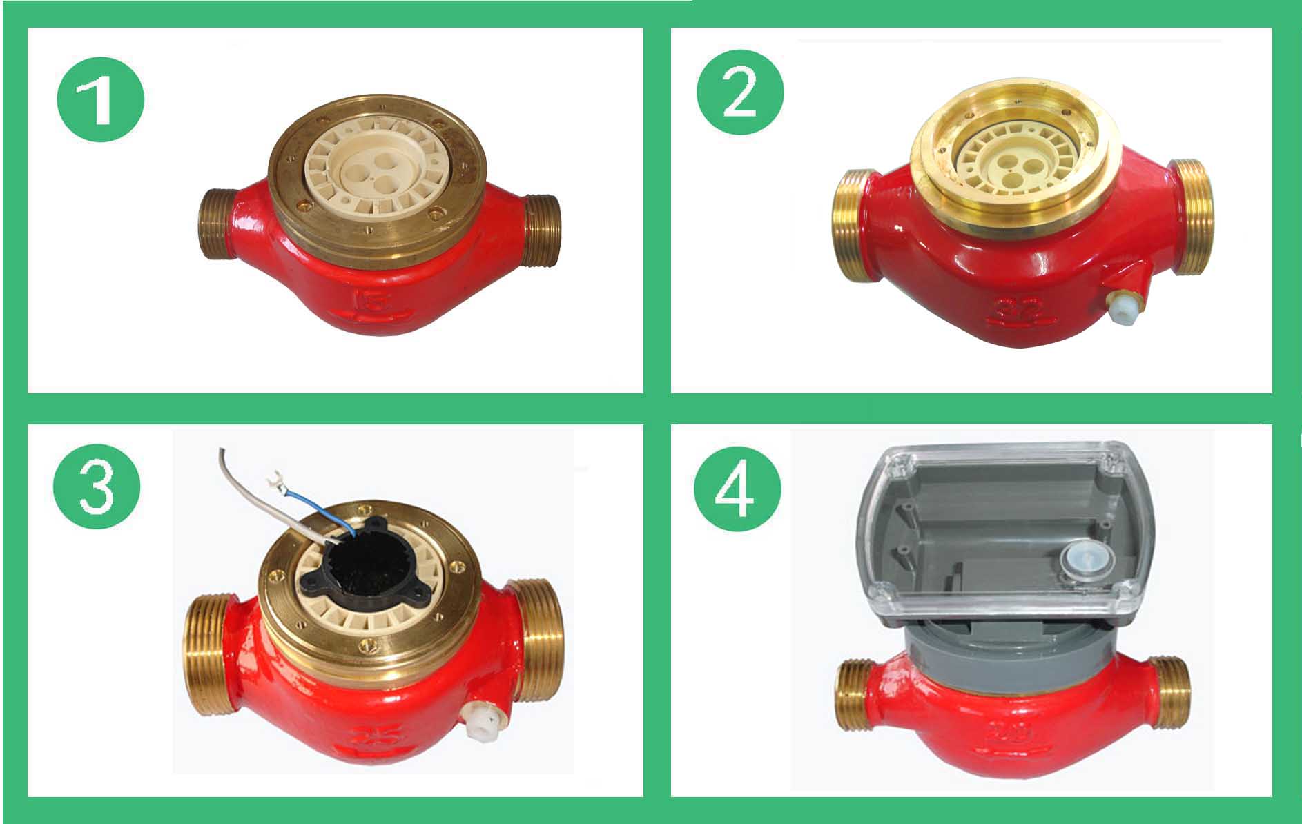 DS97TAR多流束無(wú)磁熱量表流量計(jì)的結(jié)構(gòu)如圖,其工作原理是:熱水進(jìn)入流量計(jì),經(jīng)進(jìn)水導(dǎo)向孔沖擊計(jì)量腔內(nèi)的葉輪旋轉(zhuǎn),再經(jīng)出水導(dǎo)向孔流出流量計(jì)。葉輪上面嵌有不銹鋼膜片,隨葉輪旋轉(zhuǎn),在隔板上端接近不銹鋼膜片處可裝電感類(lèi)傳感器,接受葉輪旋轉(zhuǎn)的周期信號(hào)。
