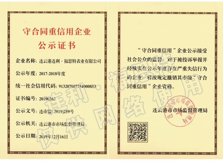 連利·福思特表業(yè)榮獲2017-2018年度連云港市 “守合同重信用”企業(yè)稱號