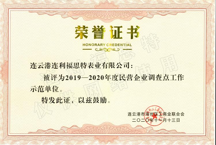 近日,連云港連利福思特表業(yè)有限公司榮獲“2019-2020年度民營企業(yè)調(diào)查點(diǎn)工作示范單位”稱號。
