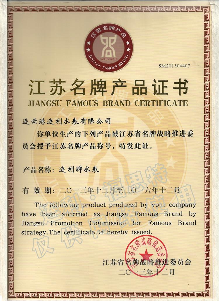 連利江蘇名牌產(chǎn)品證書(shū)