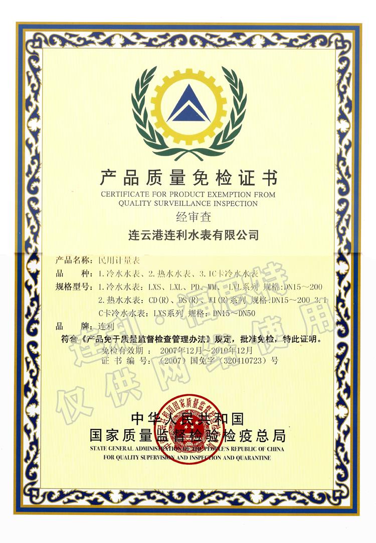 連利 產(chǎn)品質(zhì)量免檢證書(shū)